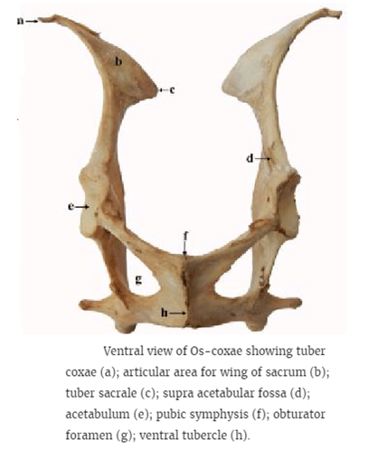 El coxal es más largo y estrecho que en la oveja, la cresta supra cotiloidea es más baja y más gruesa que en la oveja; en esta la parte isquiopubiana ofrece un pubis grueso, un agujero oval muy estrecho y una, tuberosidad isquiática de ángulos muy separados; en la cabra el pubis es delgado, el agujero oval es muy estrecho y la tuberosidad isquiática más recogida.